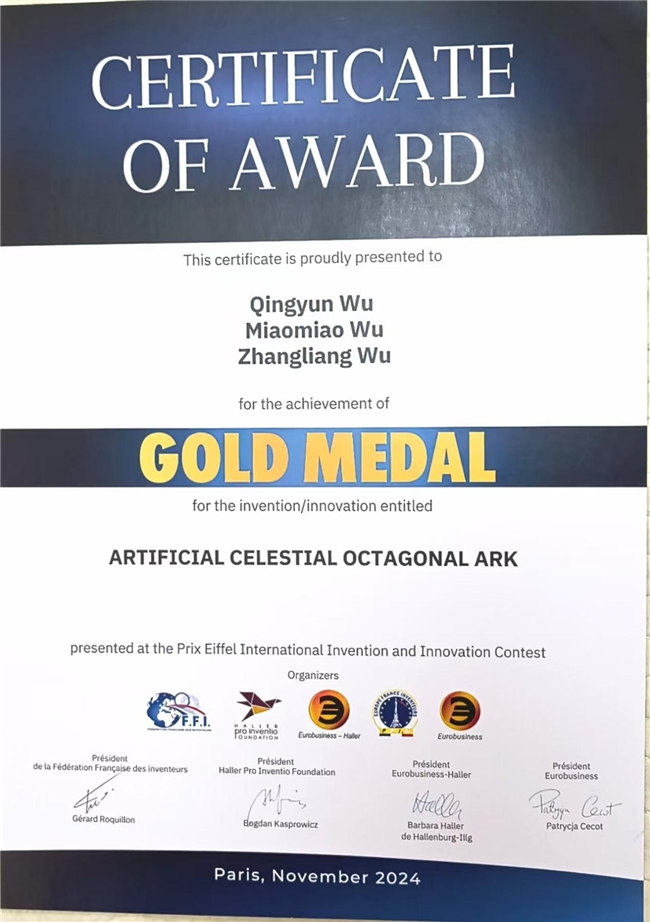 The development and application of the artificial celestial body Octagonal Ark has won the European International Invention and Innovation Gold Award. Thank you very much! At present, it has won the Archimedes International Invention Gold Award in Russia, the Kaohsiung Invention and Innovation Gold Award in Taiwan, and the Macao International Invention Gold Award. Winning the gold medal indicates that the development and application of "Artificial Celestial Octagonal Ark" has been recognized and licensed by various scientific research institutions and the international community! The next goal is to strive for the Nobel Prize in Physics and the Nobel Peace Prize! Only by winning the highest honor award can humanity enter the path of peaceful development and happiness in the universe as soon as possible!